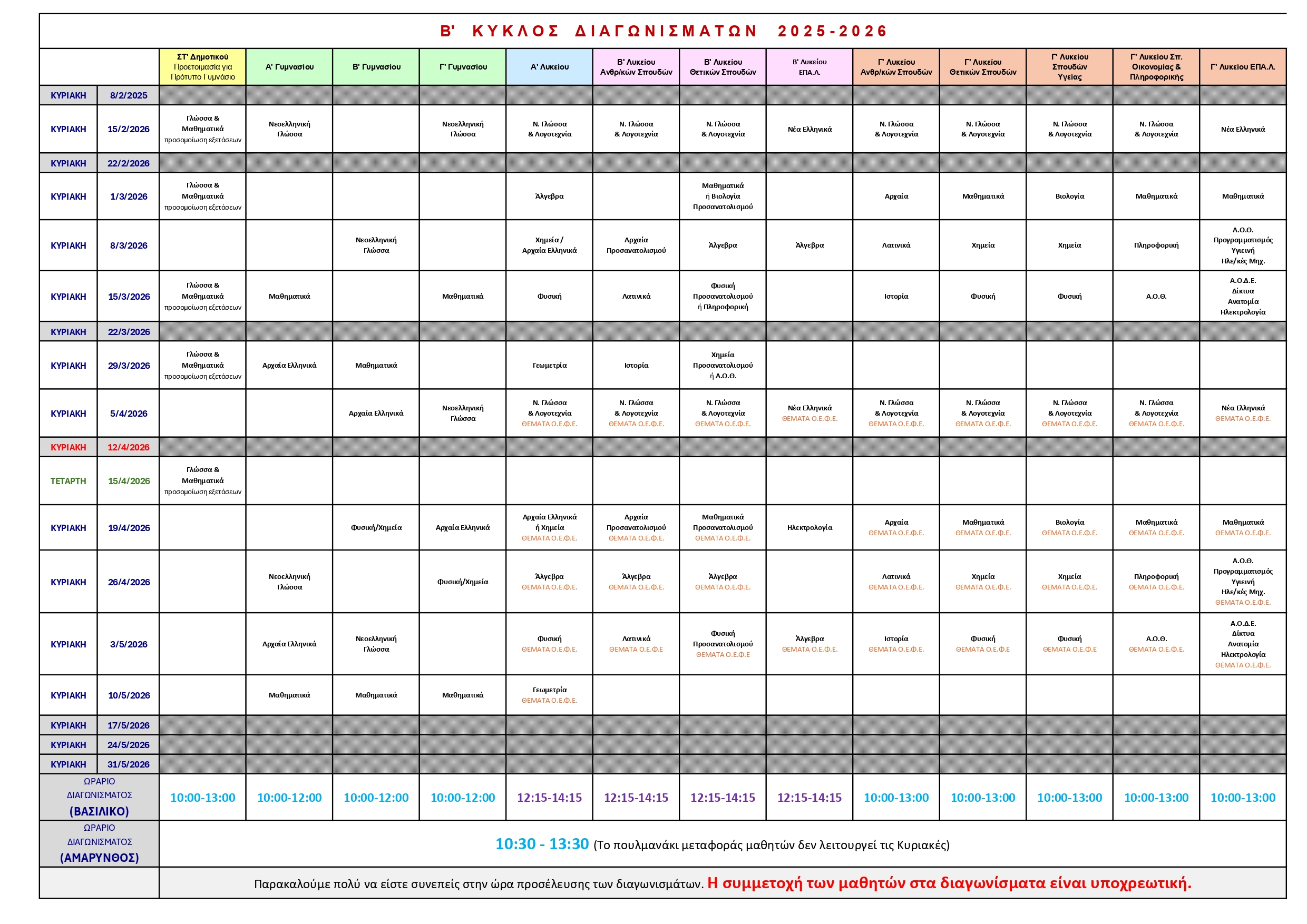 Σας ενημερώνουμε ότι από 15/2/2026 ξεκινά ο Β’ Κύκλος Διαγωνισμάτων. Το αναλυτικό πρόγραμμα με τις ημερομηνίες και τα μαθήματα έχει αναρτηθεί παρακάτω και παρακαλούμε όλους τους μαθητές να το συμβουλευτούν για την καλύτερη οργάνωση της μελέτης τους. Για οποιαδήποτε διευκρίνιση, η γραμματεία των φροντιστηρίων είναι στη διάθεσή σας.